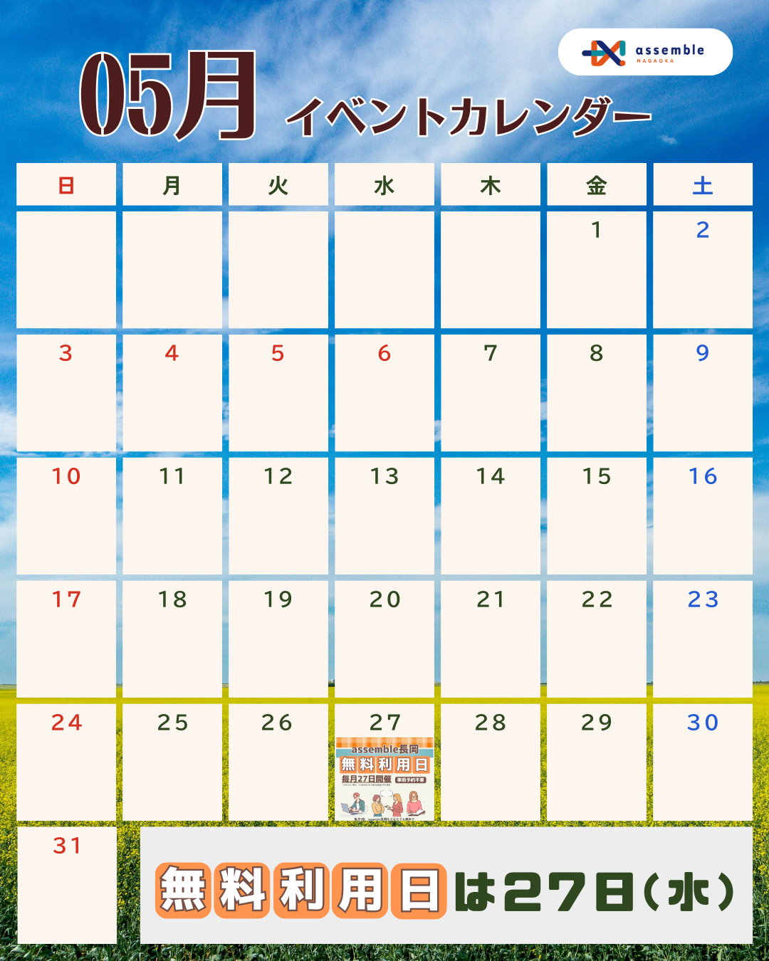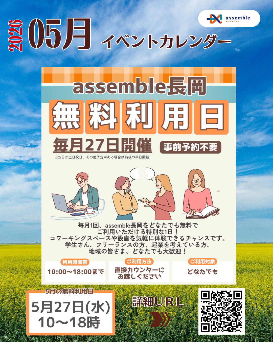 2026.04.15assemble長岡*5月イベントカレンダー assemble長岡5月のご利用案内・イベント情報等をお知らせいたします✨🎁5月イベント情報🎁(1)無料利用DAY詳細はこちらお気軽にお問い合わせください080-3242-4364 LINEで友達追加お問い合わせフォーム