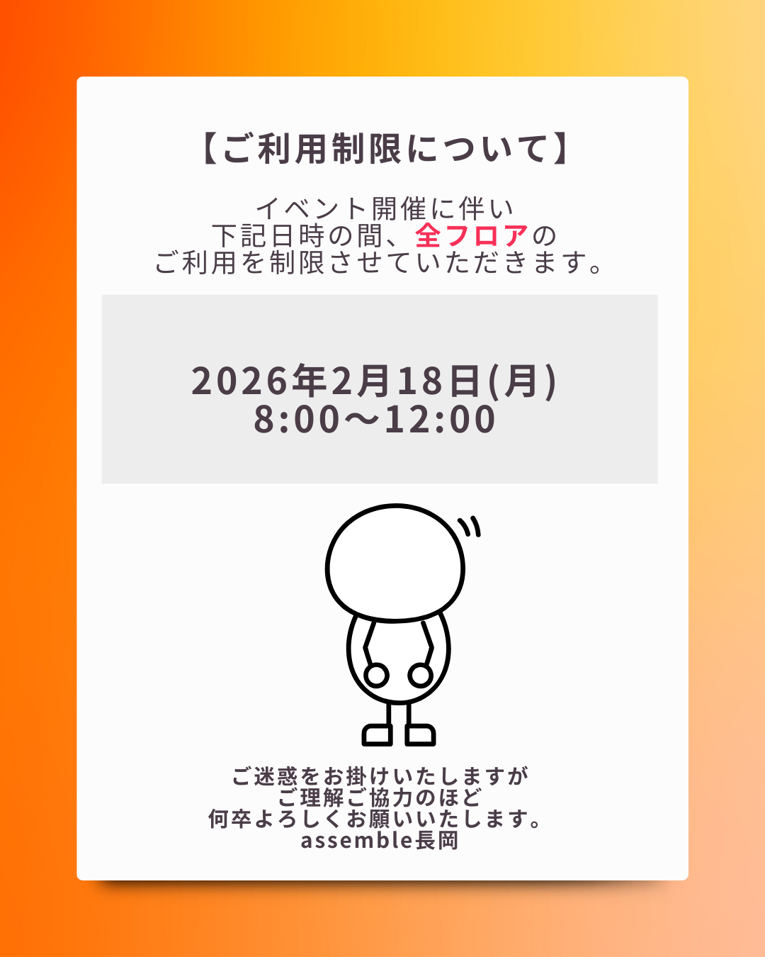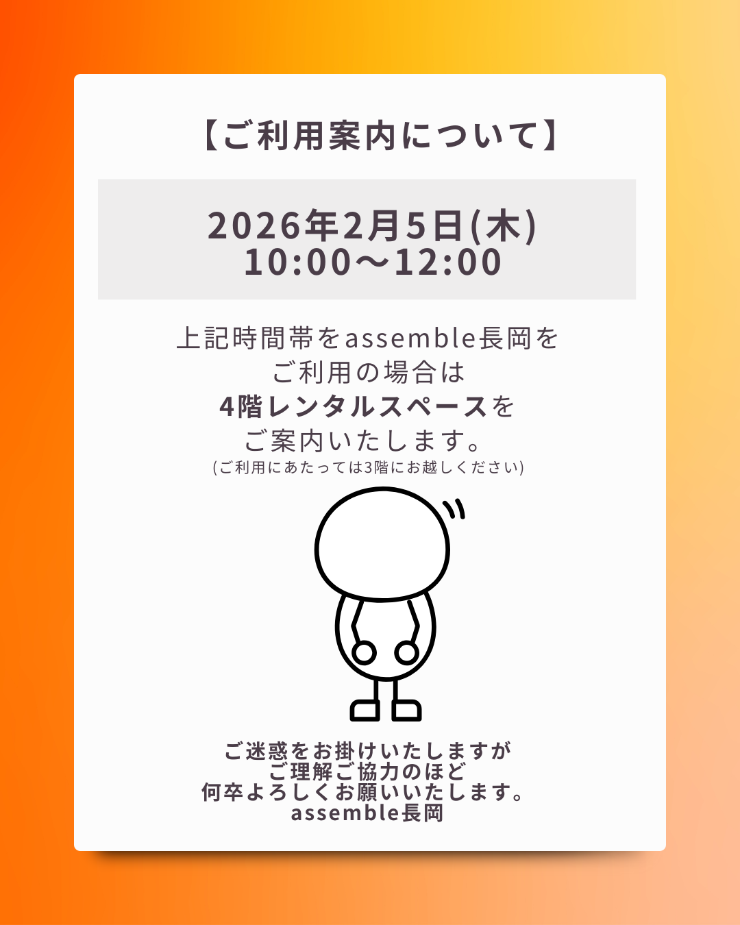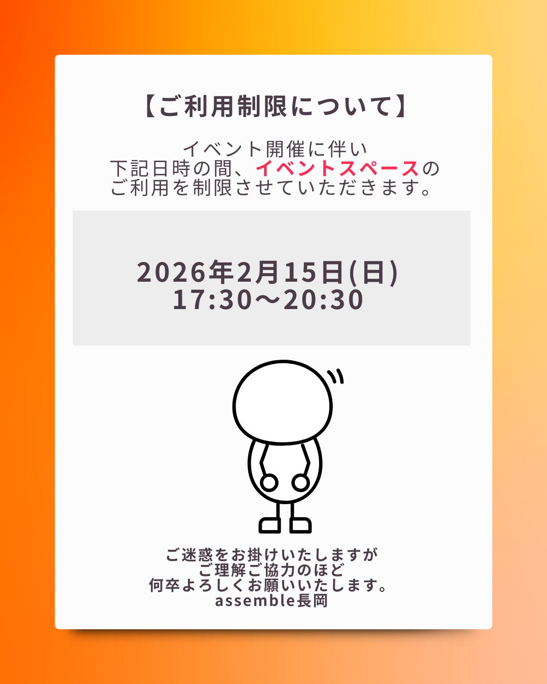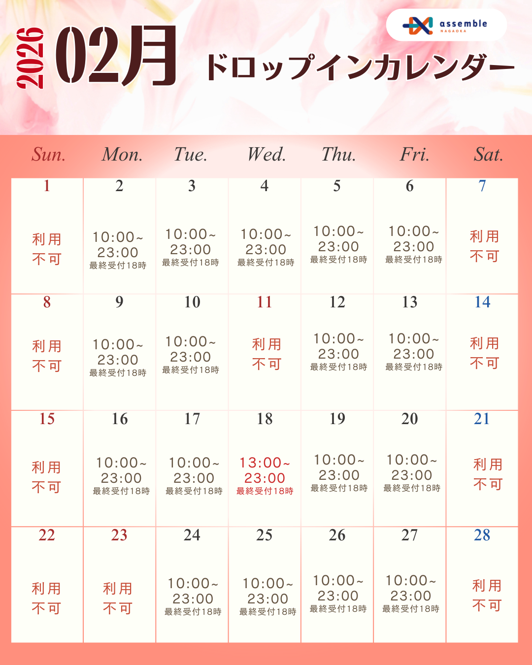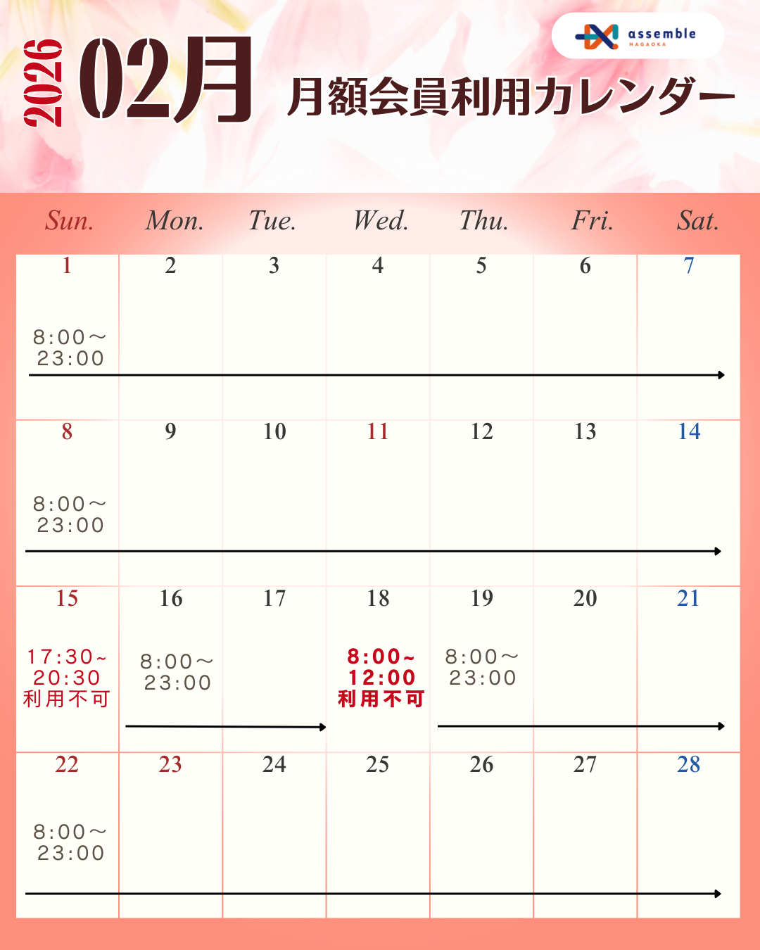assemble長岡の2月ご利用可能日をお知らせいたします⭐