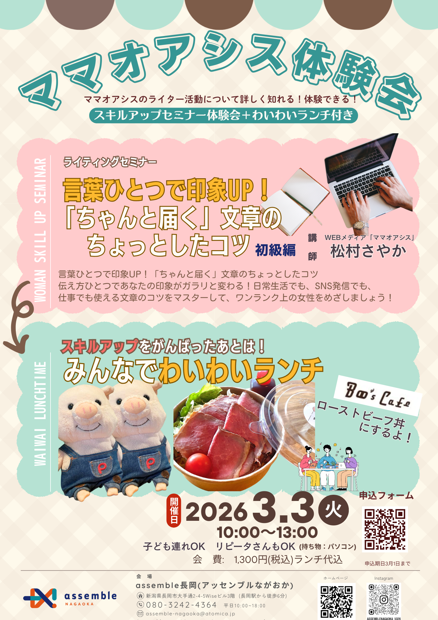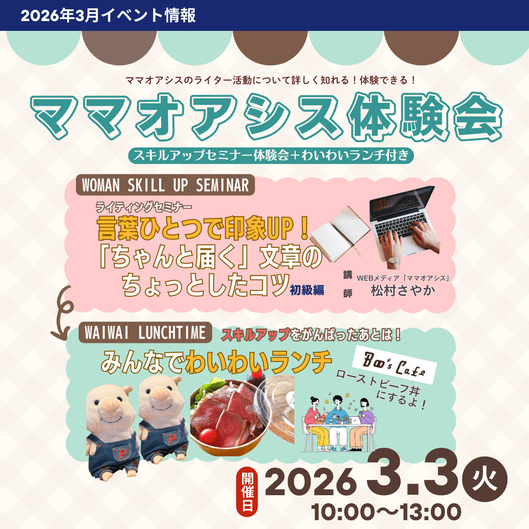【3月イベントのご案内】ママオアシス体験会!「 スキルアップセミナー体験&わいわいランチ」(開催日:3/3)