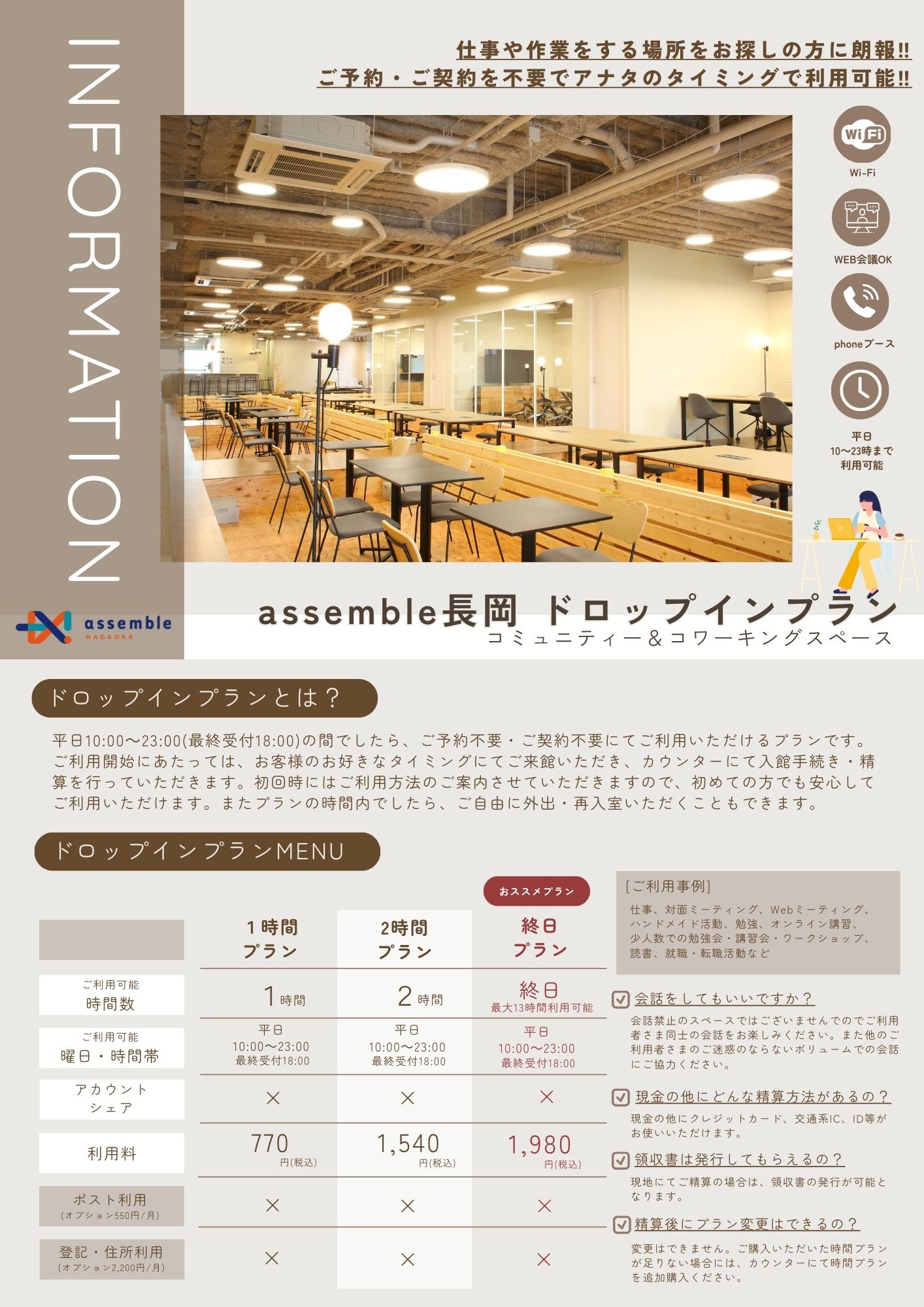 assemble長岡コワーキングスペースはどなたでもご契約不要/ご予約不要にてドロップイン利用いただけます!