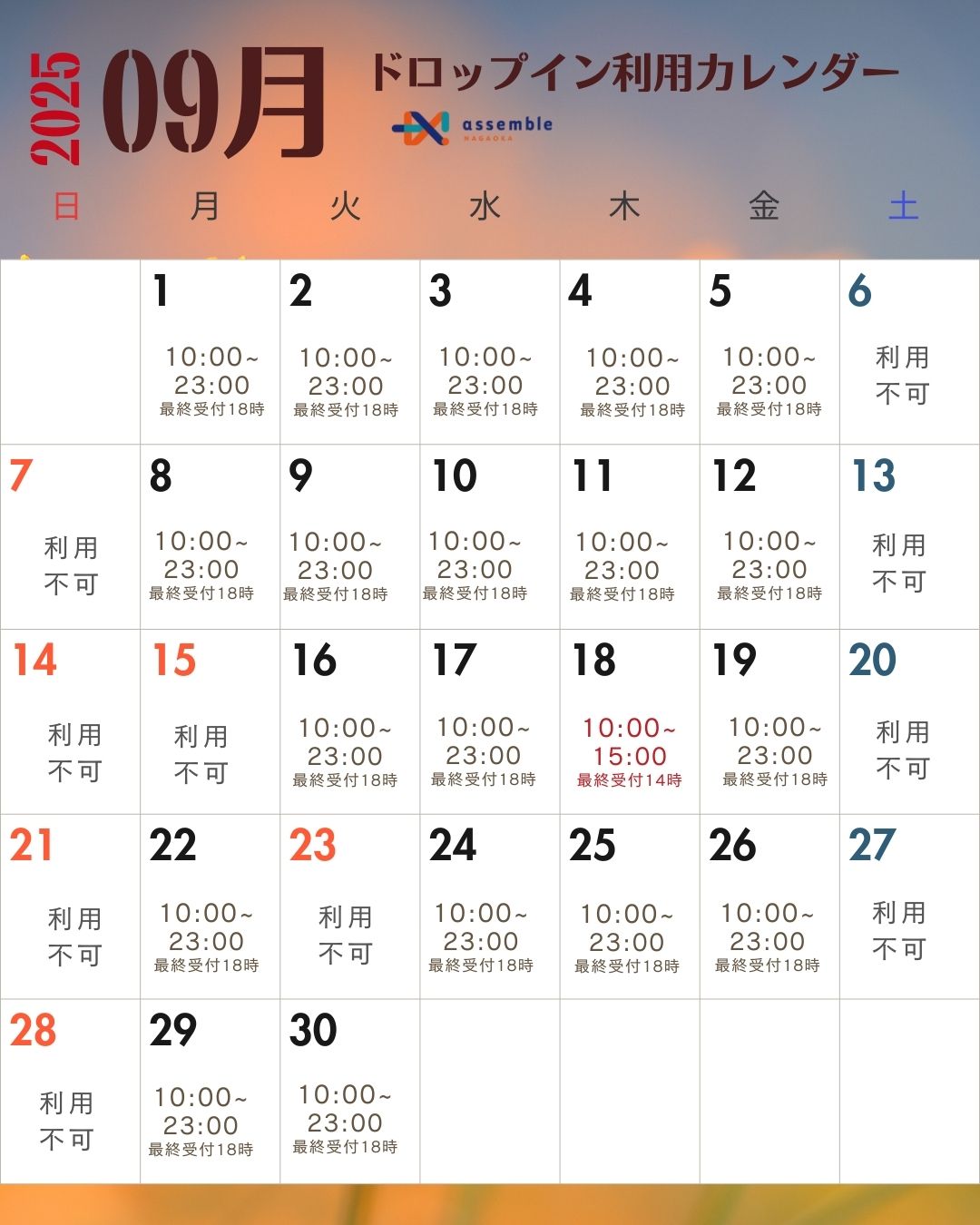 assemble長岡の9月ご利用可能日をお知らせいたします⭐