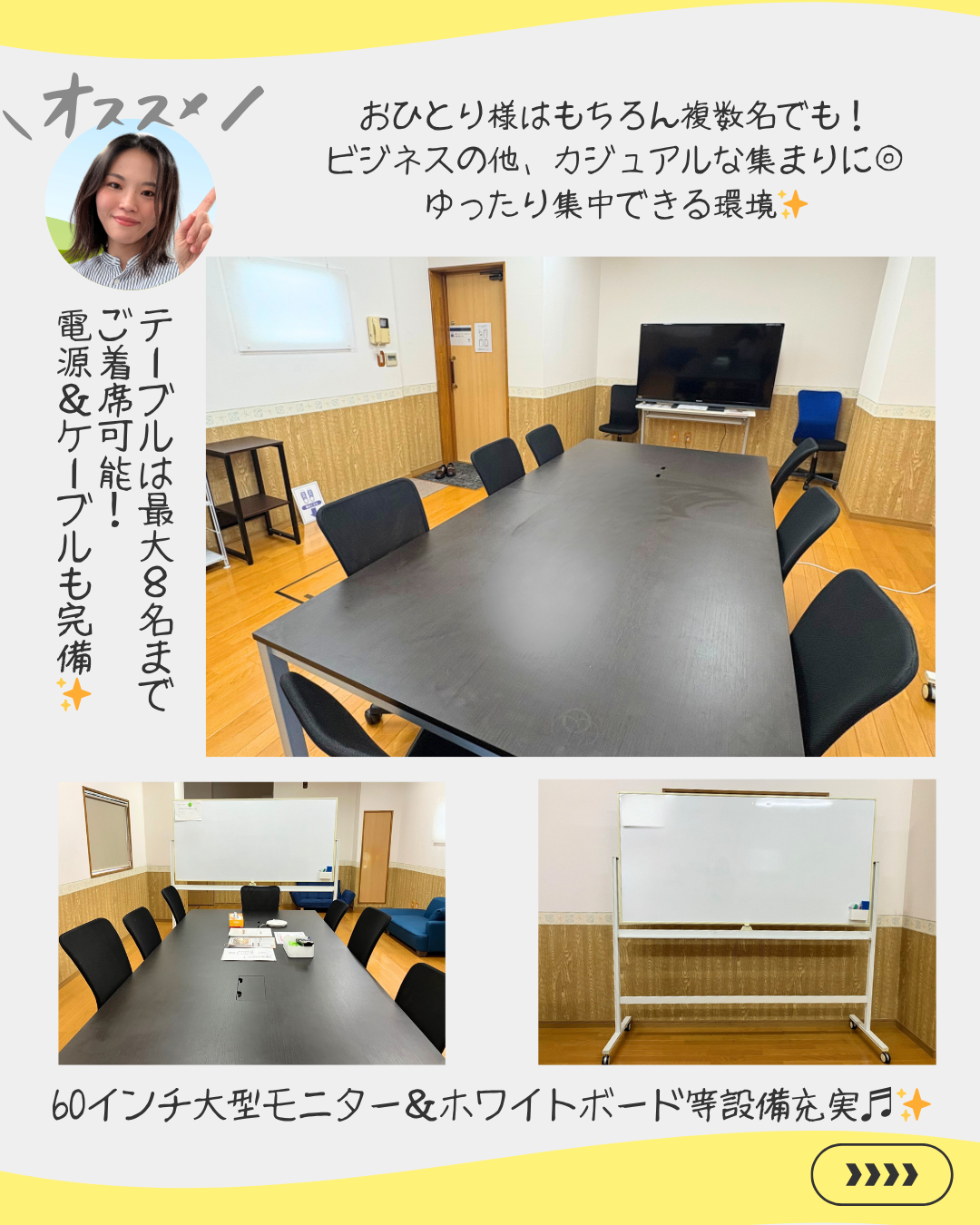 💻大型モニター・ホワイトボード完備で、会議・研修に最適ーソファスペースもあり、長時間の利用も快適