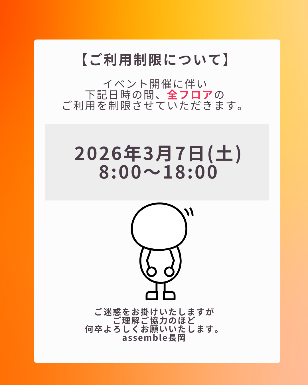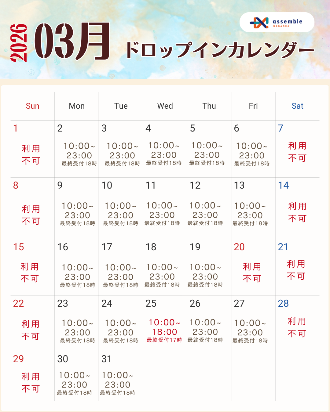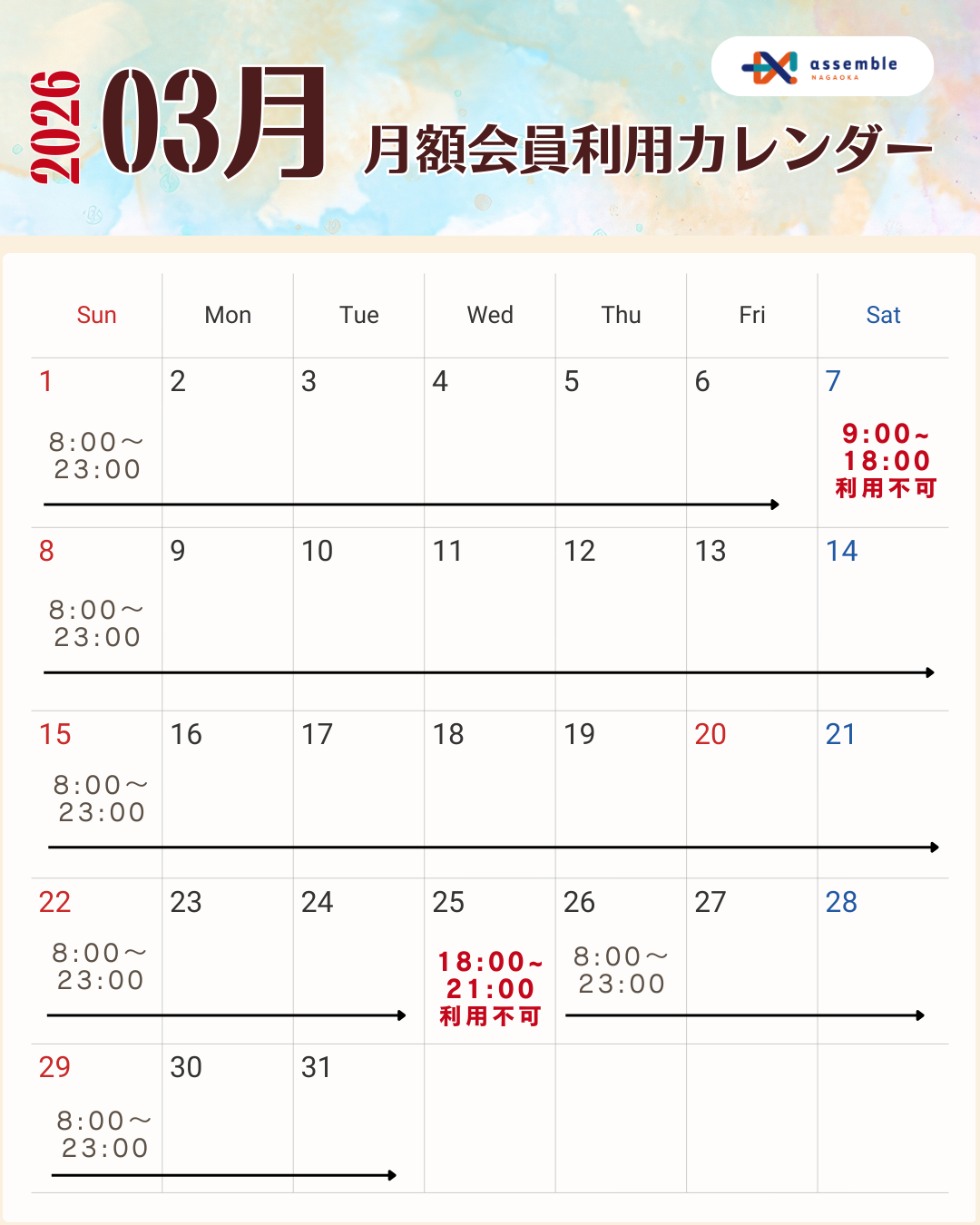 assemble長岡の3月ご利用可能日をお知らせいたします⭐